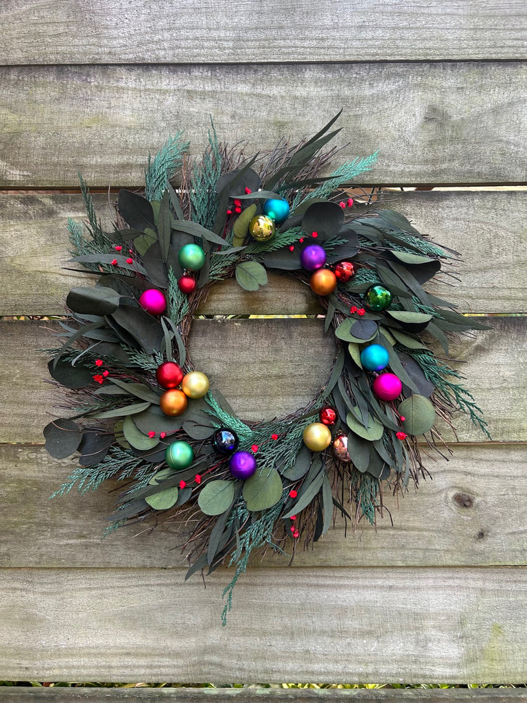 Get into the holiday spirit with our festive Holiday Bauble Wreath Workshop! Create a lush and modern wreath featuring a mix of dried eucalyptus, preserved florals, and colorful mini ornaments for a cheerful pop of holiday magic. You’ll design your own 18” wreath with a blend of natural greens and bright, joyful color.